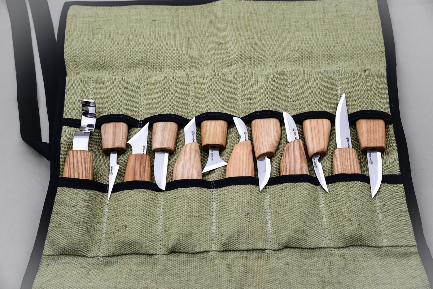 This set of twelve wood carving knives is intended for carving spoons, bowls, kuksa cups, sculptures, lettering, and other small projects. The set includes all the necessary tools to carve wooden spoons, bowls, and kuksa cups. This tool set includes small and large whittling knives, small and large bench knives, small sloyd knife, chip carving knife, small detailing knife, small cutting knife, two geometric carving knives, beveled knife, and 30mm hook knife.