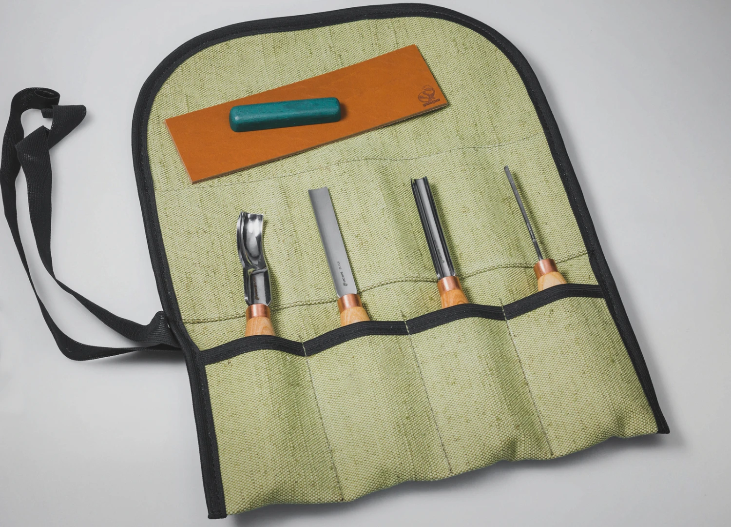 The SC01 Wood Carving Gouge Set includes chisels and a short bent gouge, and is intended for precise manual hand use rather than with hammers and mallets. The set includes a leather strop and compound to keep the tools razor-sharp, and comes in a canvas tool roll for transport and storage. See specifications for specific tools included.