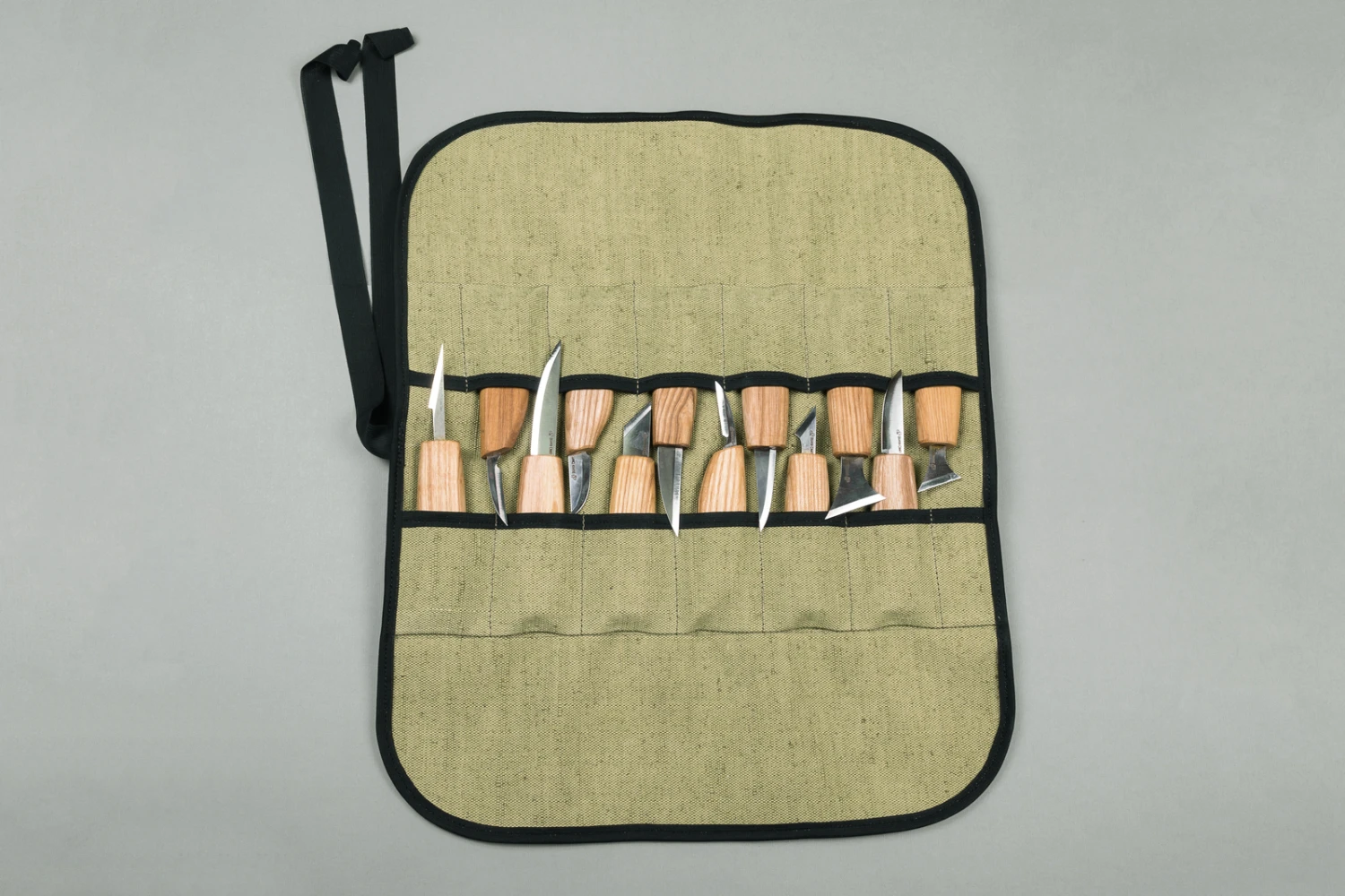 This 12-Pocket Canvas Tool Roll is designed to store and transport your knives, chisels, gouges, and other small tools safely and neatly in a compact space. A must for any woodcarver, this canvas tool roll will look wonderful in your workspace, whilst safely protecting the sharpened edges. Holds twelve tools (not included).