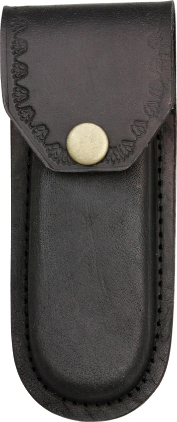 Black Leather with embossed edge pattern. Fits most 5″ folding knives. Snap closure.