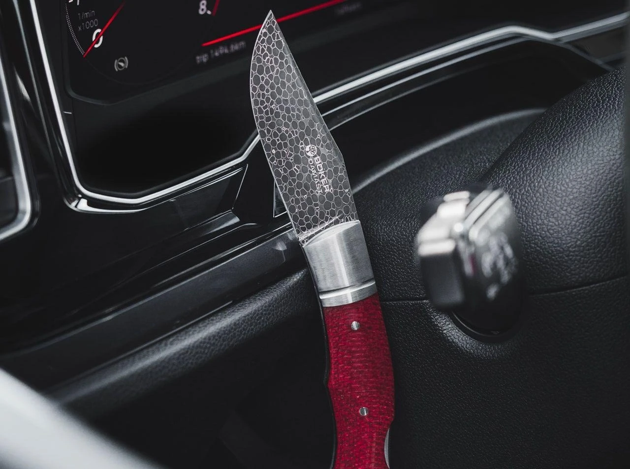The Boker Boxer, designed by Raphaël Durand from Thiers, is a classic two-handed knife that is extremely popular. In this particularly noble version, the traditional pocket knife is equipped with a dark blade of Dragonskin damascus by Bertie Rietveld, which is hardened to 58 HRC. The South African custom knifemaker is considered the country’s first damascus smith and has been forging high-performance damascus with unusual patterns since 1991. The blade is locked by a sturdy backlock and has a generous ricasso. The decorative stainless steel bolsters bear the groove typical of Raphaël Durand. The handle scales are made of polished red burlap micarta and are very comfortable to hold. The handy size is the perfect compromise between pocket suitability and versatility in use. With reinforced lanyard hole. Handmade in the Boker knife manufactory Solingen. Delivery with individual serial number in a noble floating display with certificate of authenticity.