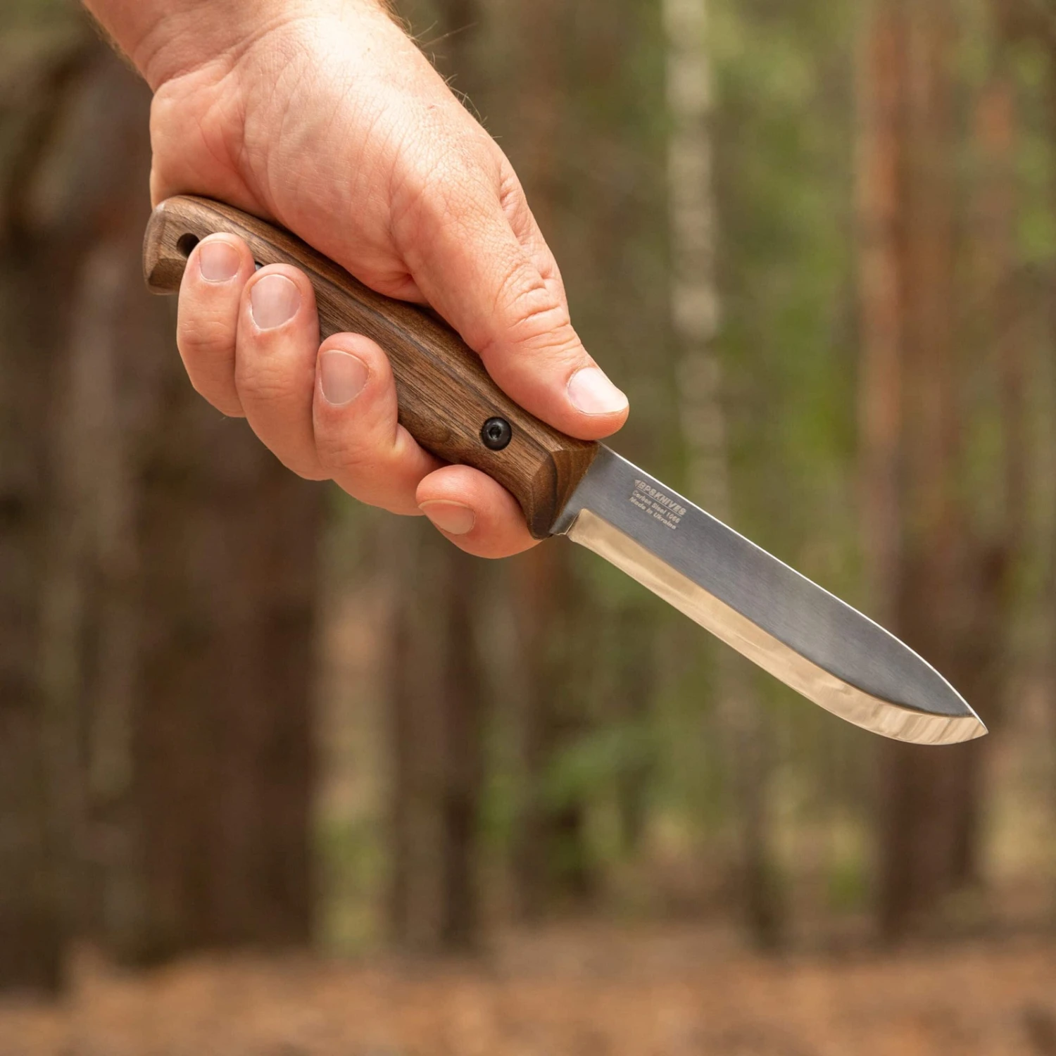 The handle of the knife is made of walnut wood, covered with Danish oil, making this camping knife not to be afraid of moisture and dirt. The handle is attached to the tang with Corby bolts that can be easily unscrewed to clean the knife. Also, this knife model can be easily and quickly customized.