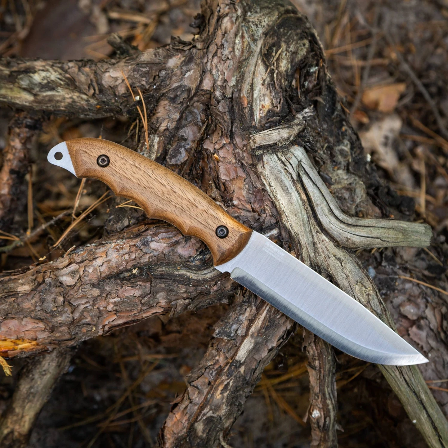 The handle of the knife is made of walnut wood, covered with Danish oil, making this camping knife not to be afraid of moisture and dirt. Handle is fixed with cable ties, it can be easily unscrewed in order to clean the knife.