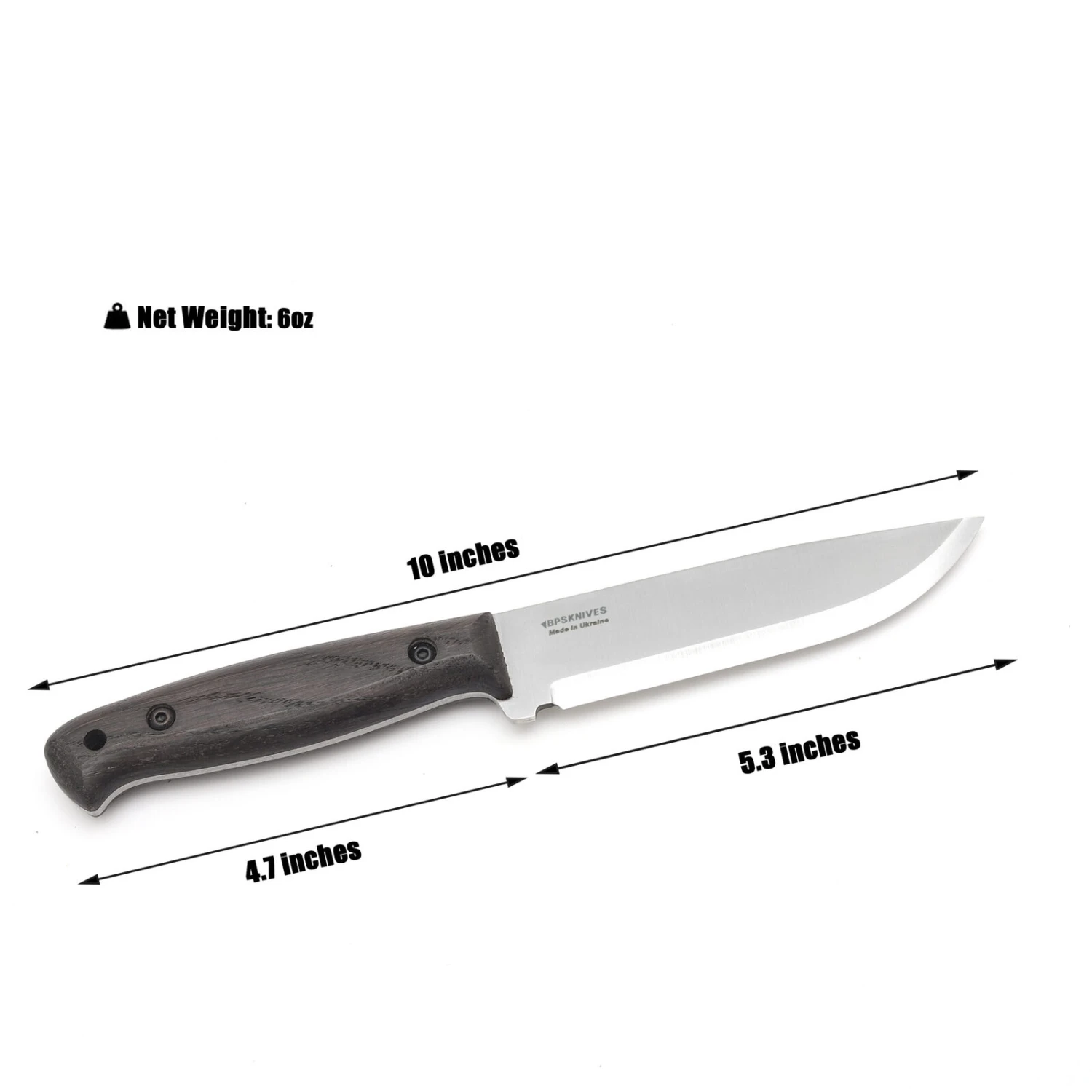The knife handle is made of bog oak, one of the most expensive and sturdy types of wood. The handle is coated with Danish oil, which makes this bushcraft knife resistant to moisture and dirt. The handle is fixed with Corby ties that can be easily unscrewed for knife cleaning.