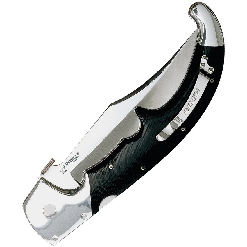 When everyone else in our industry made the smallest, flimsiest, dainty little knives that they could, Cold Steel released a series of blades that could only be described as one thing – pocket swords! The Cold Steel Espada was inspired by the classical Navaja knives of Spain, but was utterly modern in both appearance and materials. These mega-folders took the market by storm! A design collaboration between custom knife maker Andrew Demko and Cold Steel President Lynn C. Thompson, Espadas are available in two sizes to suit both the bold and the boldest of individuals! Despite their imposing size, Espadas are expertly designed to fit comfortably and discreetly in your pocket. You’ll soon forget that you are carrying such a large and impressive blade. Equipped with the patented Demko Thumb Plate, the Large and Extra Large Espadas can be snagged on your pocket, opening the knife as you draw it – and opening in the blink of an eye! The Espada’s beautiful blades are made from premium American S35VN Alloy Steel – chosen for its ability to not only take a super-fine cutting edge, but to hold it for an exceptionally long time.They also feature expertly polished G-10 scales and mirror polished 7075 Aluminum bolsters and frame. Each Espada is equipped with Cold Steel patented Tri-Ad locking mechanism, proven to have amazing shock resistance and strength. In Cold Steel’s notoriously brutal product testing, the XL Espada was not only capable of holding 600lbs of free hanging weight, but gthey even used it to support a hanging engine block!