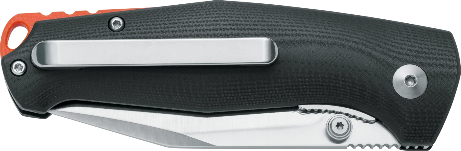 This TUR model sports a black G-10 handle, a satin finished clip point blade, and an orange G-10 backspacer.
