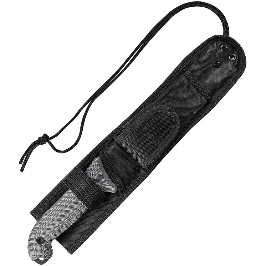Milling on the Micarta handles defies the elements by providing a sure grip in any weather condition while also offering a contoured design that fits with your hand’s natural shape. Pass cordage through the lanyard hole to keep the SCHF52M close at hand. The black polyester sheath, with its Velcro loop, makes it easy to attach the sheath without the need to remove your belt. Lash the sheath to your leg or other gear with the available cordage.