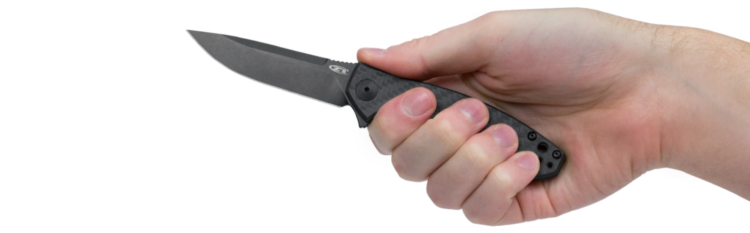 This sophisticated ZT is a smaller option that offers a robust combination of premium-quality materials. The front handle is carbon fiber, balancing the knife’s solid construction with lightweight convenience. The DLC-coated titanium back handle offers a secure frame lock—so you can always cut with confidence. As an extra visual touch, ZT added two eye-catching emerald-green tube spacers that stand out attractively against the dark handle.
