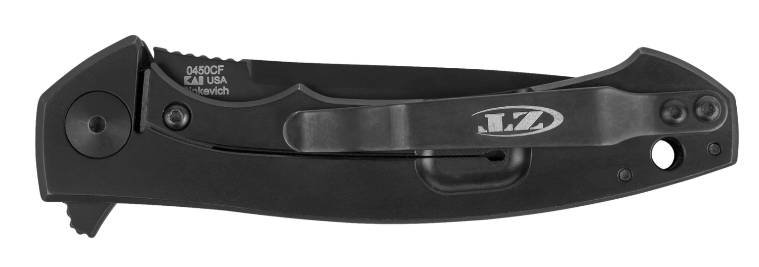 - Carbon fiber front scale with black DLC-coated steel back; secure frame lock